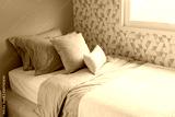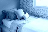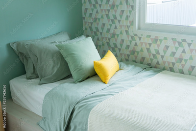 Contemporary teen bedroom with green pillow and modern side table lamp.