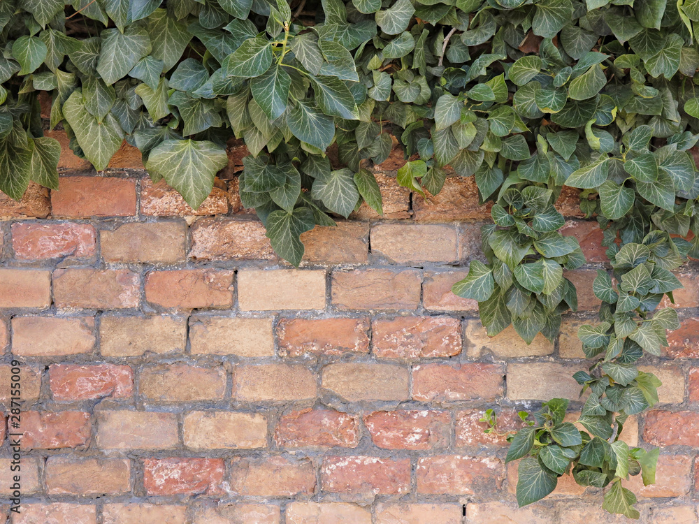 Old Texture brick wall, background, detailed pattern covered in ivy