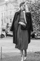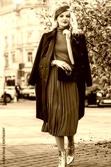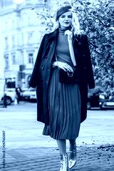 Street style autumn fashion concept: full-length portrait of elegant lady wearing burgundy color woolen coat, light blue pleated skirt, beret, metallic color ankle boots, holding small quilted bag