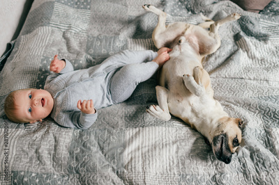 Little baby boy playing with puppy on bed