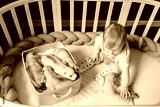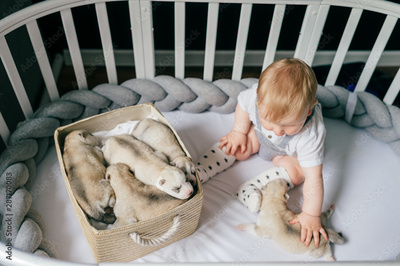 Little child siiting in crib with newborn husky puppies