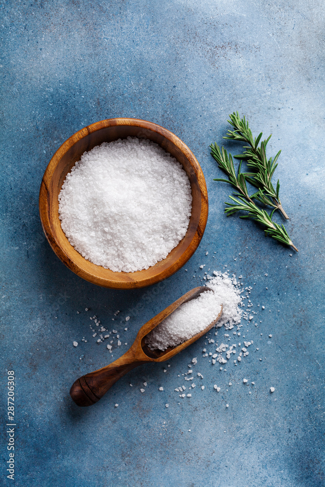 Salt in wooden bowl and rosemary on blue background top view.