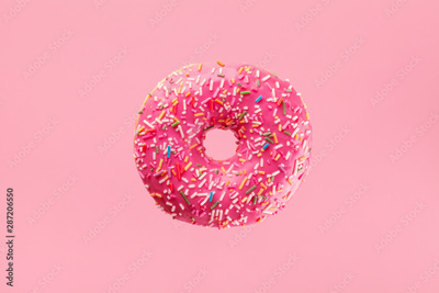 Minimal composition of flying pink donut. Sweet doughnut on pastel background.