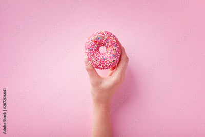 Woman hand holding pink donut or doughnut on pastel background. Flat lay.