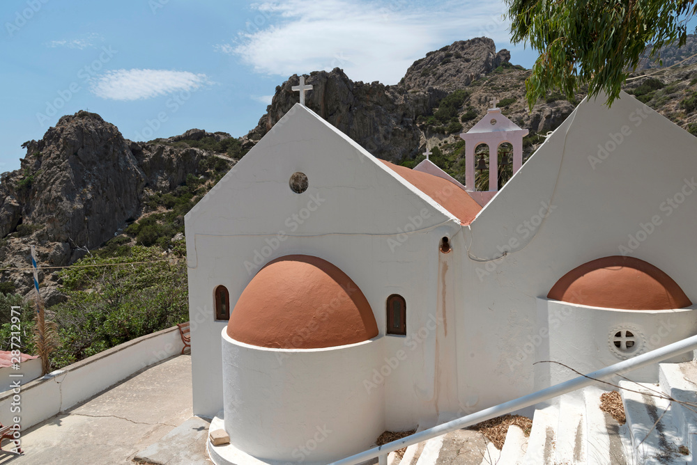 Crete, Greece. June 2019. The monastery of the All Holy Virgin at Paplinou in the mountains above Ierapetra in the south of the island.