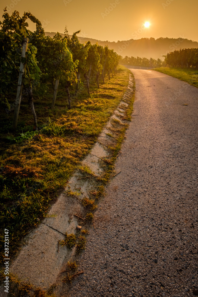 Strasse im Weinberg mit Reben und Sonne