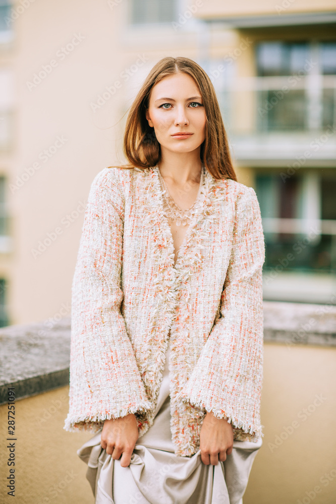 Outdoor fashion portrait of young woman wearing stylish peach colour jacket and silk skirt