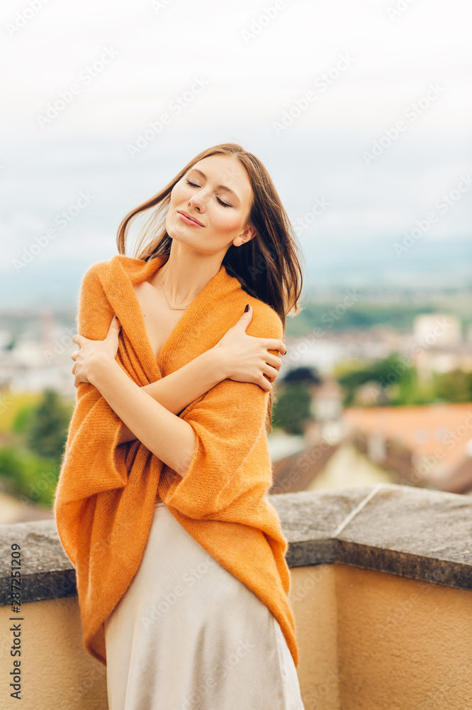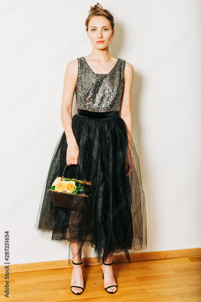 Fashion portrait of stylish young woman wearing long black dress