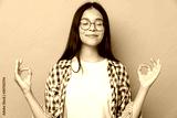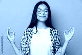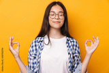 Pleased optimistic young cute teenage girl in glasses meditate isolated over yellow wall background.