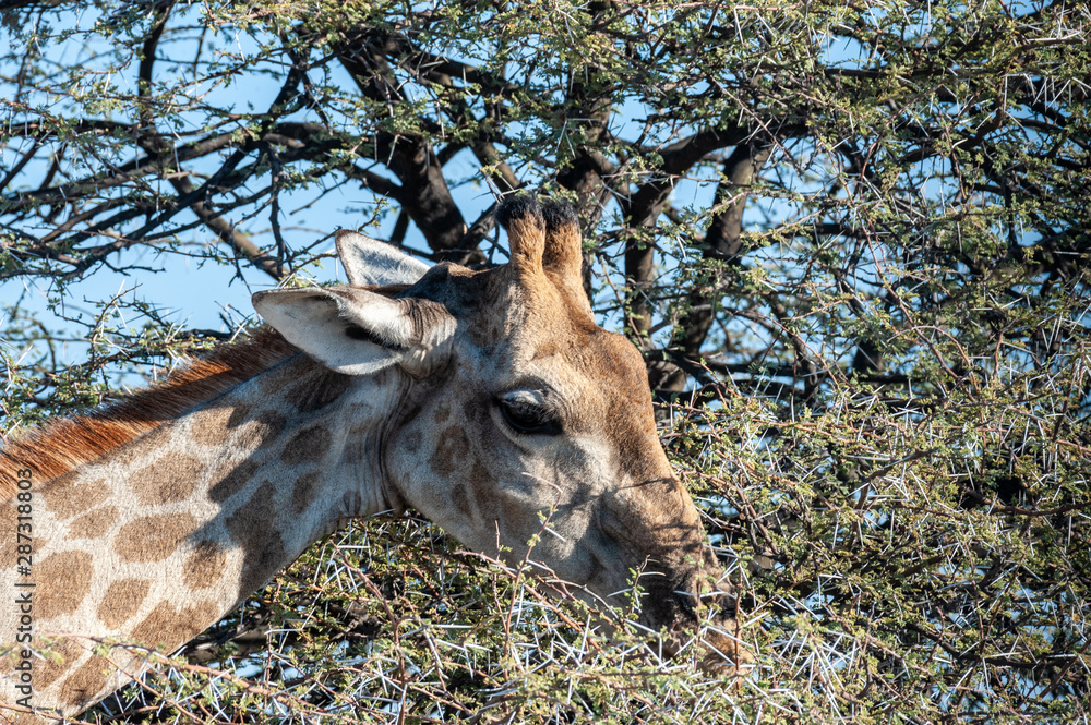 Detail of the head of an Angolan Giraffe -Giraffa giraffa angolensis- eating scrubs from the bushes. Etosha National Park, Namibia.