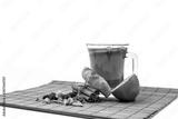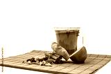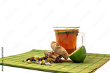 Glass cup of herbal mixture tea with cinnamon roll, sage, ginger root, linden, daisy and half lime. Decorated with dried herbs. Isolated on white background and green organic table mat - side view.