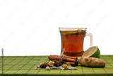 Glass of herbal tea with cinnamon, sage, ginger root, linden, daisy and lime slice. Dried star anise around. Isolated on white background and green organic table mat covered bottom - side view.