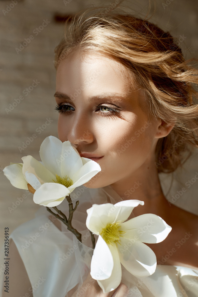 Perfect bride with jewels, a portrait of a girl in a long white dress. Beautiful hair and clean delicate skin. Wedding hairstyle blonde woman. Girl with a white flower in her hands