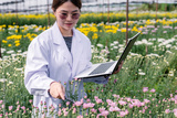 Asian female researchers holding a laptop and stand to explore the chrysanthemum garden. Exploration and research concept