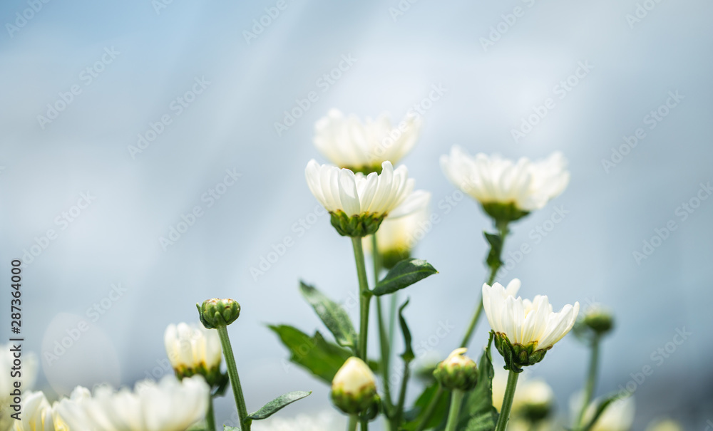 White chrysanthemum flowers blooming with sweet soft bokeh from light and white background
