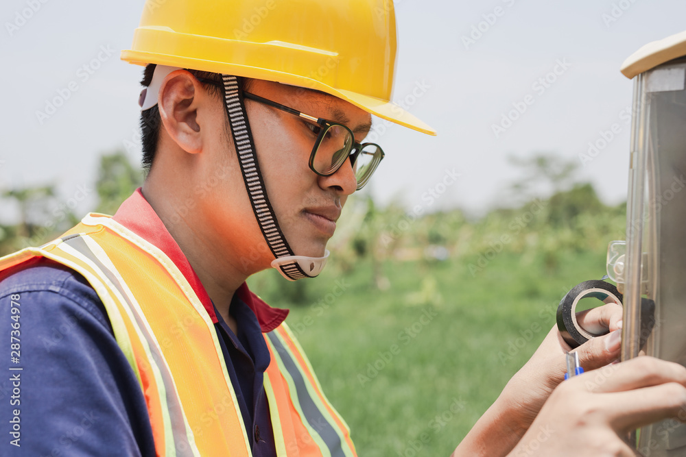 Young man electrical engineer is working to check and repair electrical equipment, outdoor