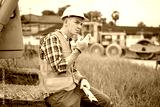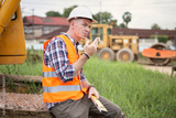 Portrait of handsome guy engineers sit and relax by smoking on a crane during breaks in the construction site.