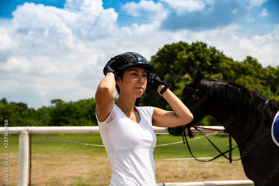 In stable. Horse riding, a woman puts on a toque.