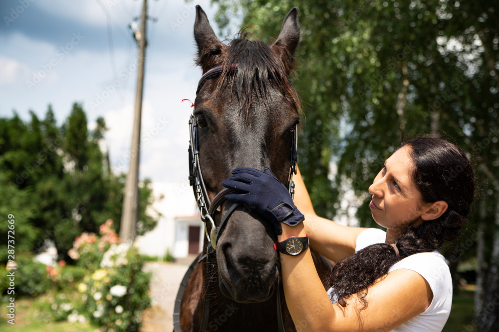 A woman and a horse at the stud. Horse Riding,