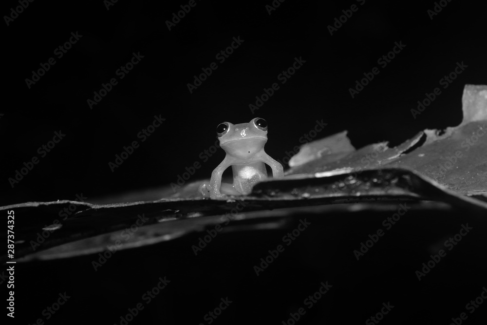 Black and white photo of a glass frog showing his intestines while sitting on a leaf and looking straight at the camera