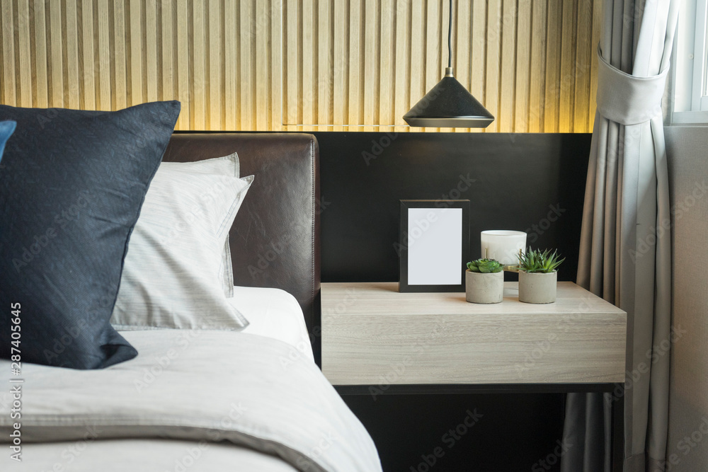 Blue and gray cushion in master bedroom with plant pot and picture frame by the window.