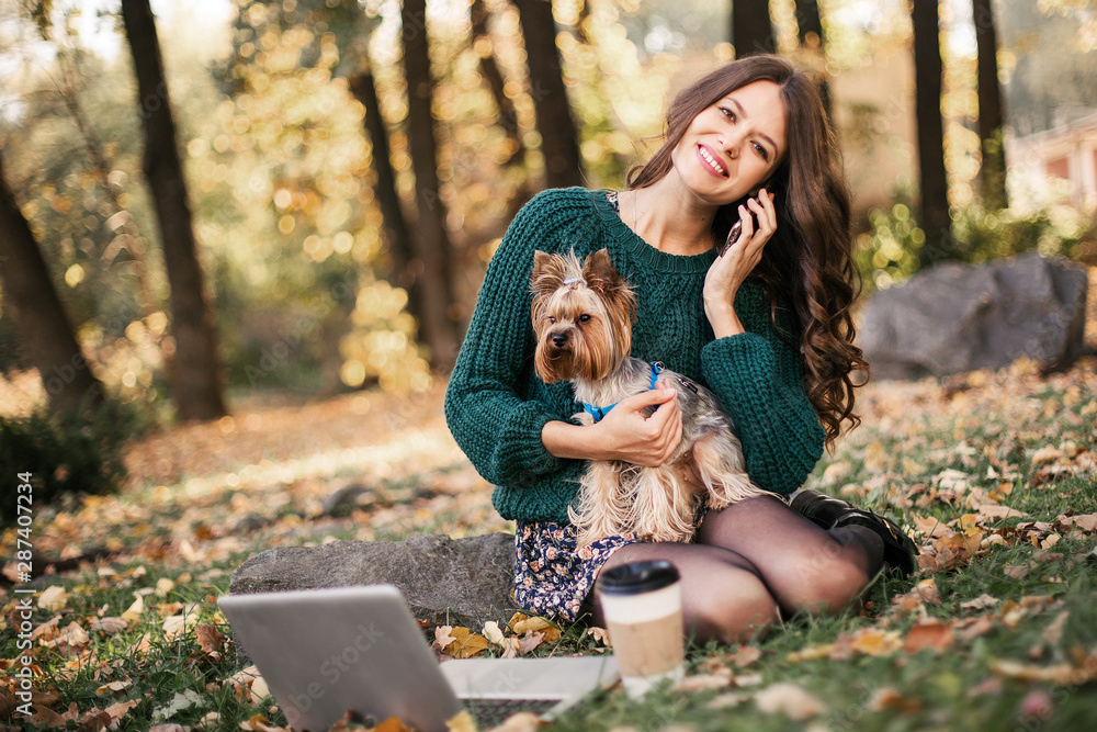 Woman working on laptop and talking on the phone in the park with dog in her arms.