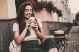 Beautiful woman drink coffee sitting on street cafe.