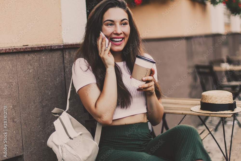 Beautiful woman using phone and drink coffee sitting on street cafe.