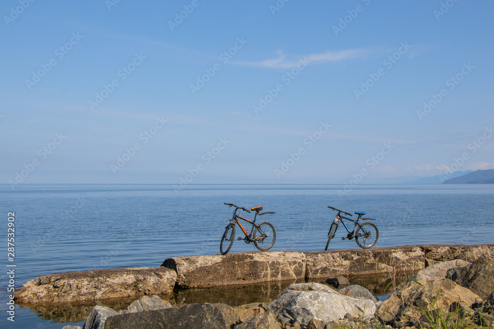 2 bicycles standing on stones against backdrop of Lake Baikal.