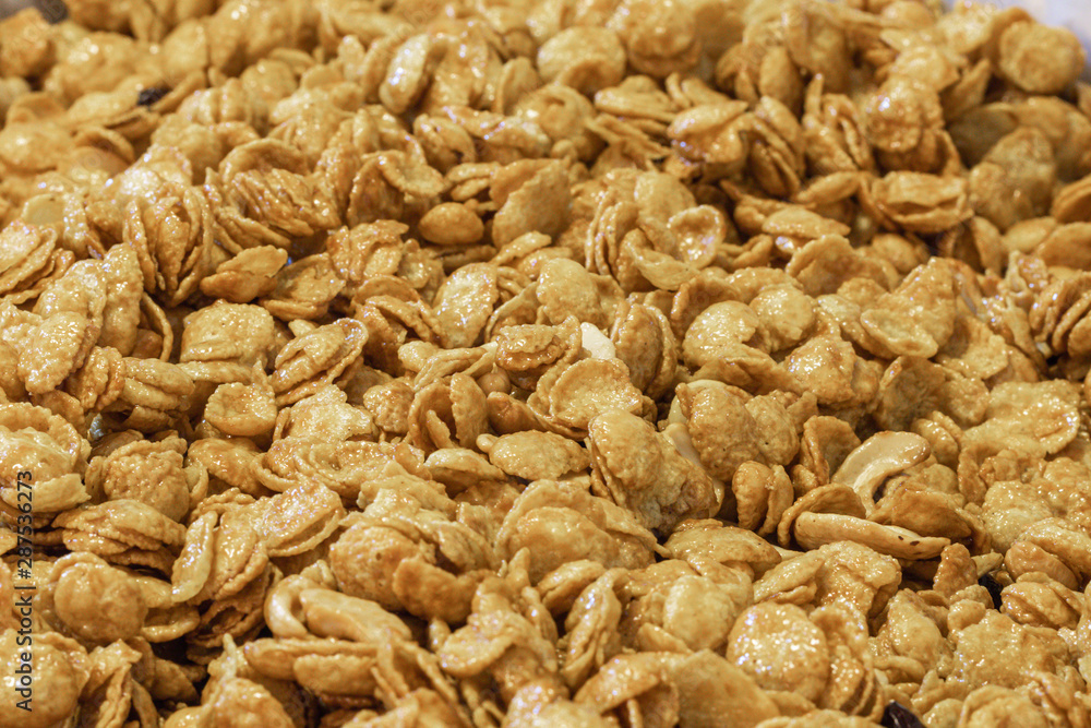 Delicious cereal caramel cornflakes warm tone background. A Breakfast cereal made by flakes of corn.
