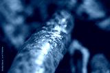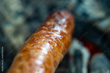 Sausage roasted on the coals in the fire, impaled on a stick. Junk food nature