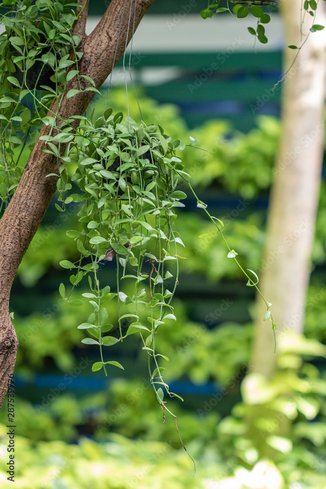 Dave green plants (Dischidia nummularia Variegata) hanging in a garden.