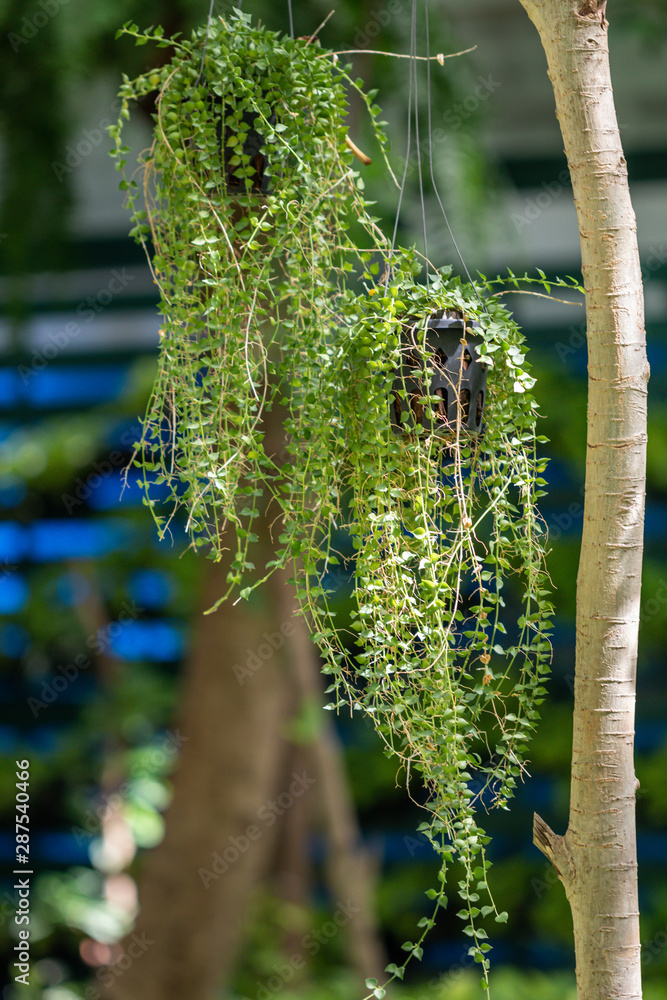 Dave green plants (Dischidia nummularia Variegata) hanging in a garden.