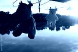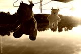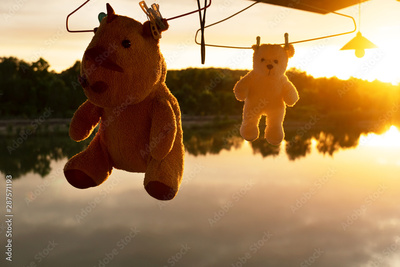 silhouette hanging rhino and bear toy in washing process with orange lake sunset natural background