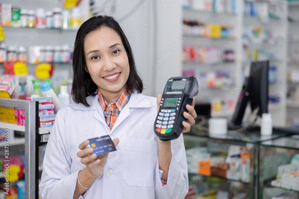 asian female pharmacist in pharmacy and credit card machine health care and digital payments concept