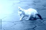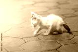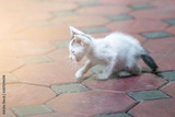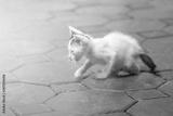 A black and white kitten walk on a pathway.Stray baby cat on ground.