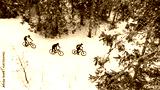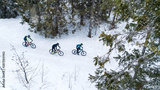 Aerial view of mountain bikers riding on road in forest outdoors in winter.