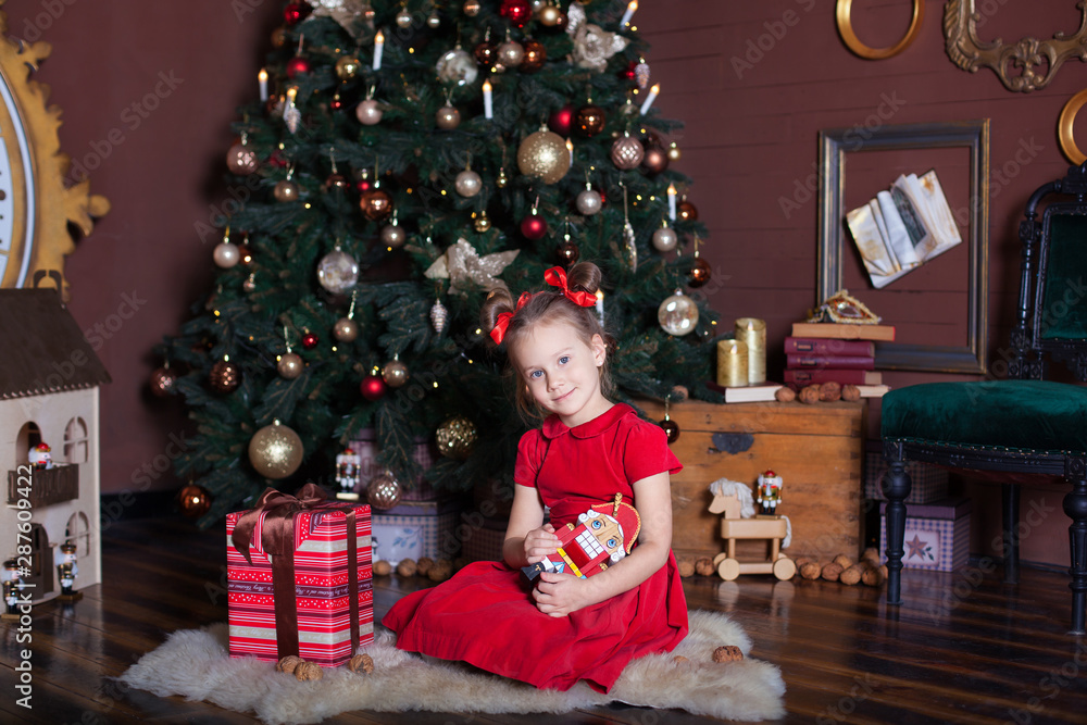 New Year 2020! Merry Christmas, happy holidays! Happy little girl with a gift on the background of the Christmas tree. Christmas is coming. The child received a holiday gift. Best Christmas presents.