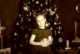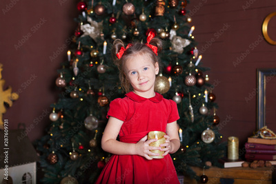 New Year 2020. Merry Christmas, happy holidays. Close-up portrait of a little girl with a candle. Little girl holds a candle in her hands in front of a Christmas tree. New Years Eve. Christmas Eve.
