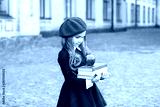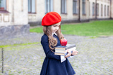 Back to school. Child education and school concept. Little girl in a red beret holds a stack of books with an apple. Ready for school. Healthy primary school child. autumn, schoolgirl, lunch