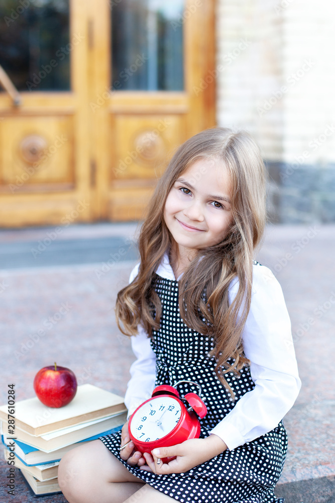 Back to school. Education and school concept. Preschool education. Girl with alarm clock. Child little girl hold red clock. It is time. Always on time. It is never too late. Time concept. Schooltime
