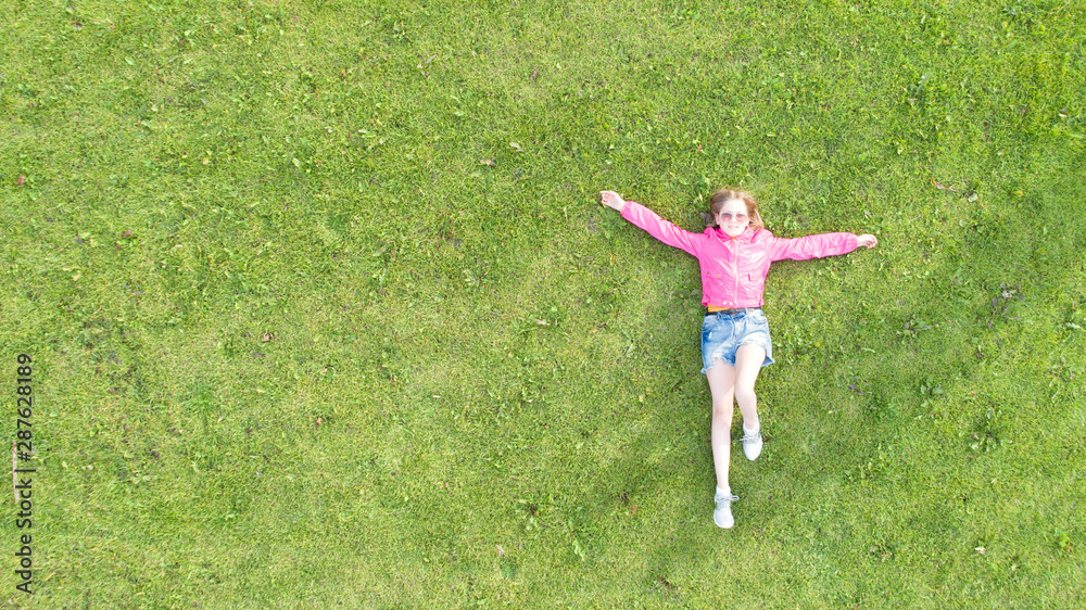Aerial view. Young girl lying and resting on lawn on sunny day in park on grass. Above view. Top view