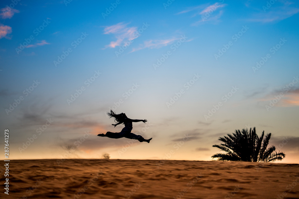 Young gymnast woman jumping in the dunes of Morocco