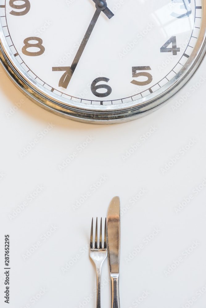 Vertical view of knife and fork with clock on white background - intermittent fasting concept (selective focus)