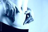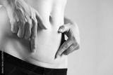 Closeup of woman showing on her belly dark scar from a cesarean section. Healthcare concept.
