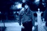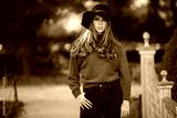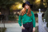 Sunshine young teen girl with red curly hair is wearing green knitted sweater and fashion hat in yellow autumn park.
