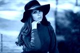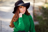 Portrait of sunshine young teen girl with red curly hair is wearing green sweater and fashion hat in autumn park.