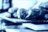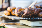 Meat delicacies and smoked meats on the market counter. Bushmeat. Sausages and pork