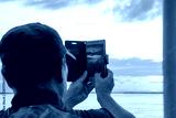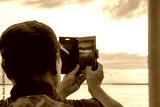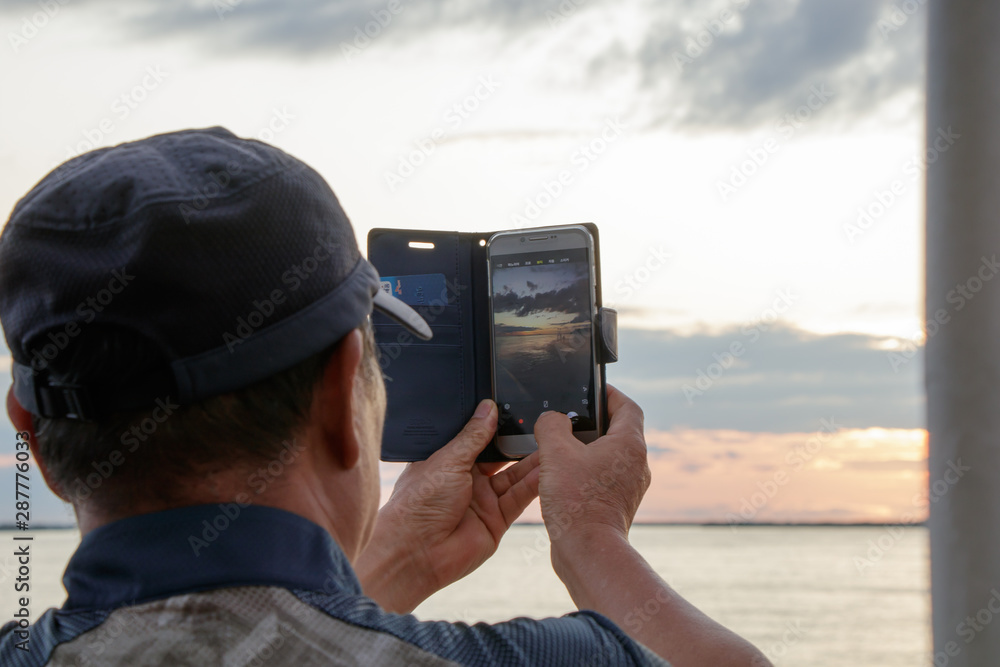 A Chinese tourist shoots a sunset on a smartphone on the Amur River.