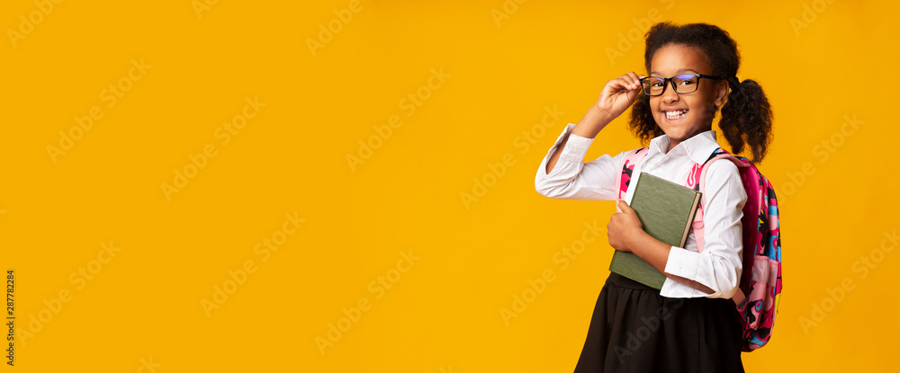 Black Schoolgirl Posing With Books Over Yellow Background